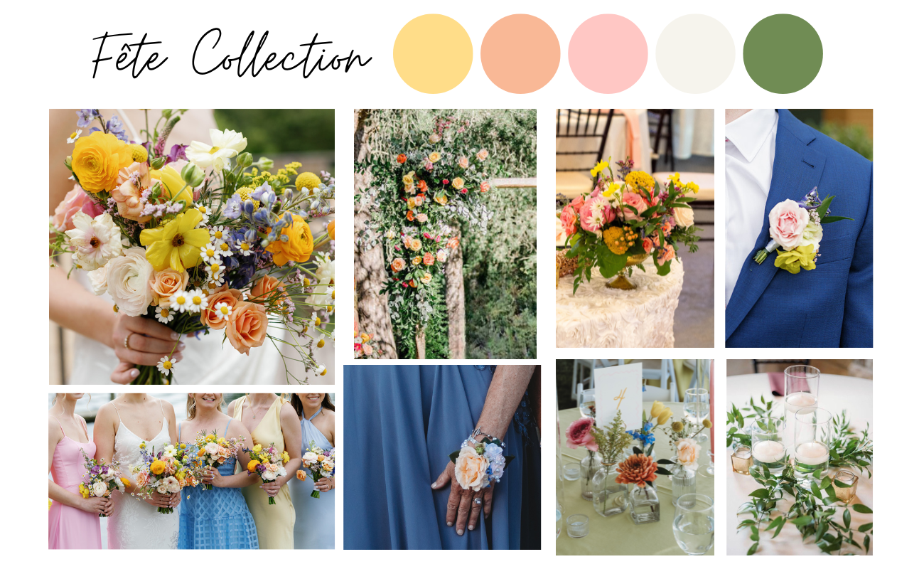 The Fête Collection features fun and vibrant pops of peach, yellow, pink, and lavender in an assortment wildflowers with lush greenery. We love weddings with fun and vibrant colors! This is the perfect spring and summer palette! Let your guests know that they are there not only to party but also to celebrate love and joy of the occasion with this fun and vibrant collection.