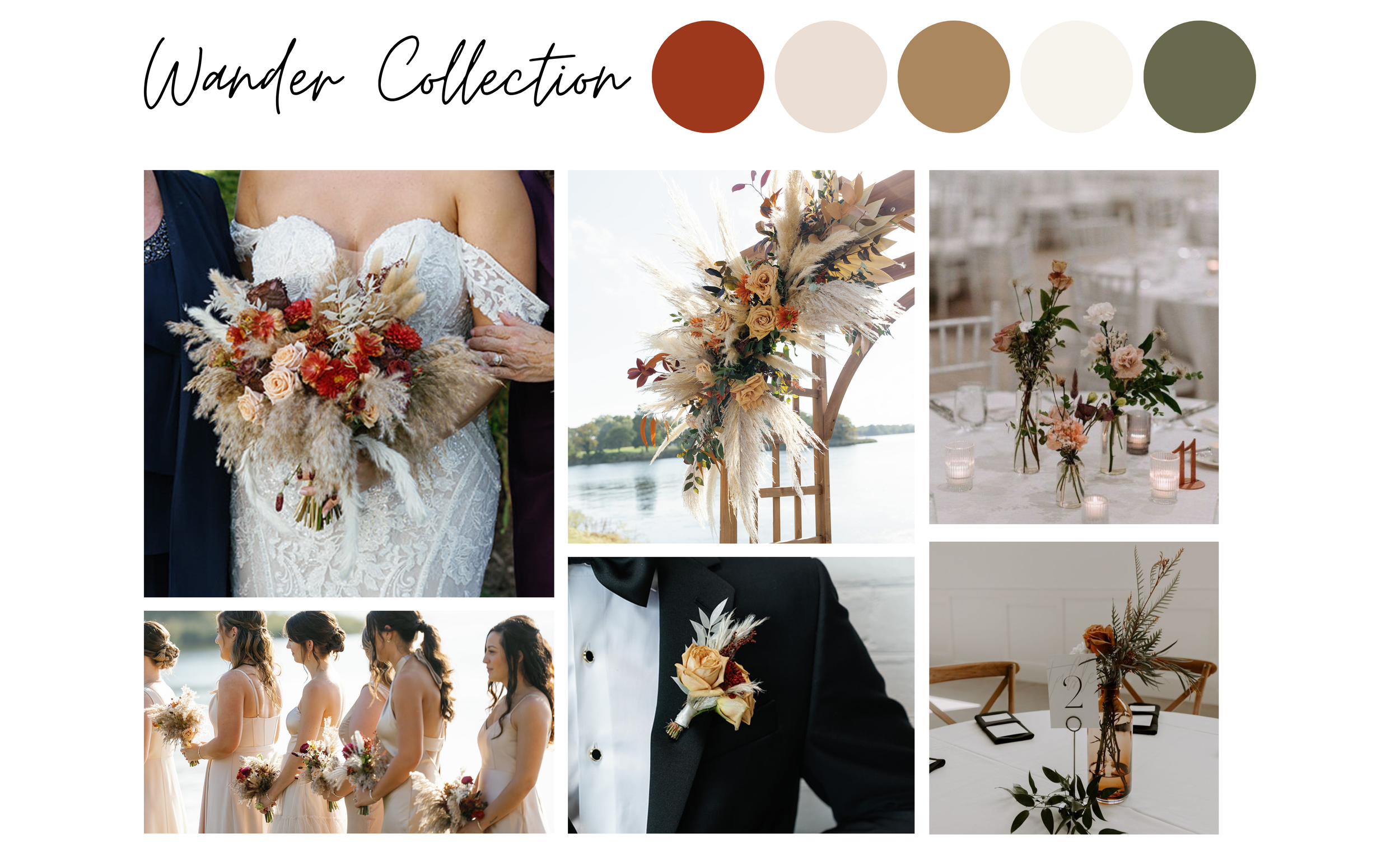 The Wander Collection showcases an earthy, boho aesthetic featuring warm, natural tones, pampas grass, and natural foliage. This is our most requested fall palette! If you’re looking for nature-inspired elegance with rustic yet modern touches, this collection is perfect for you!
