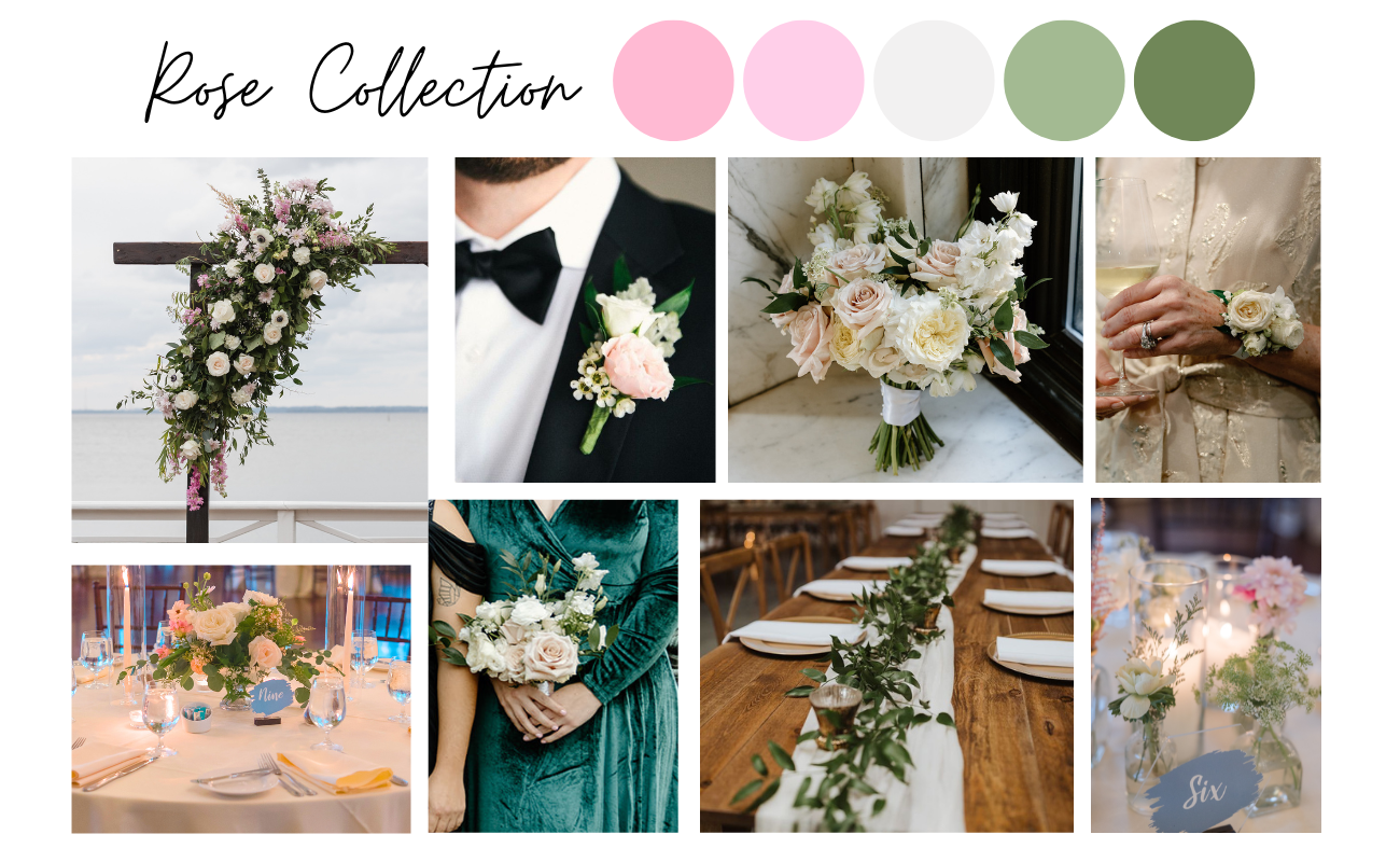 The Rose Collection features white blooms and greenery with a hint of blush pink. This color combination is reminiscent of classic, feminine beauty. If you love the concept of a neutral color palette that includes a subtle yet charming pop of color, then this collection is the perfect fit for your vision!